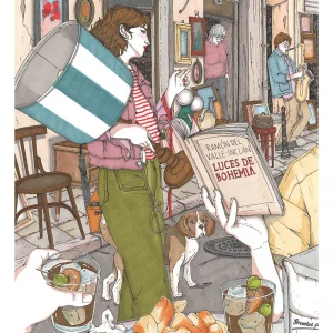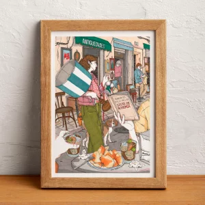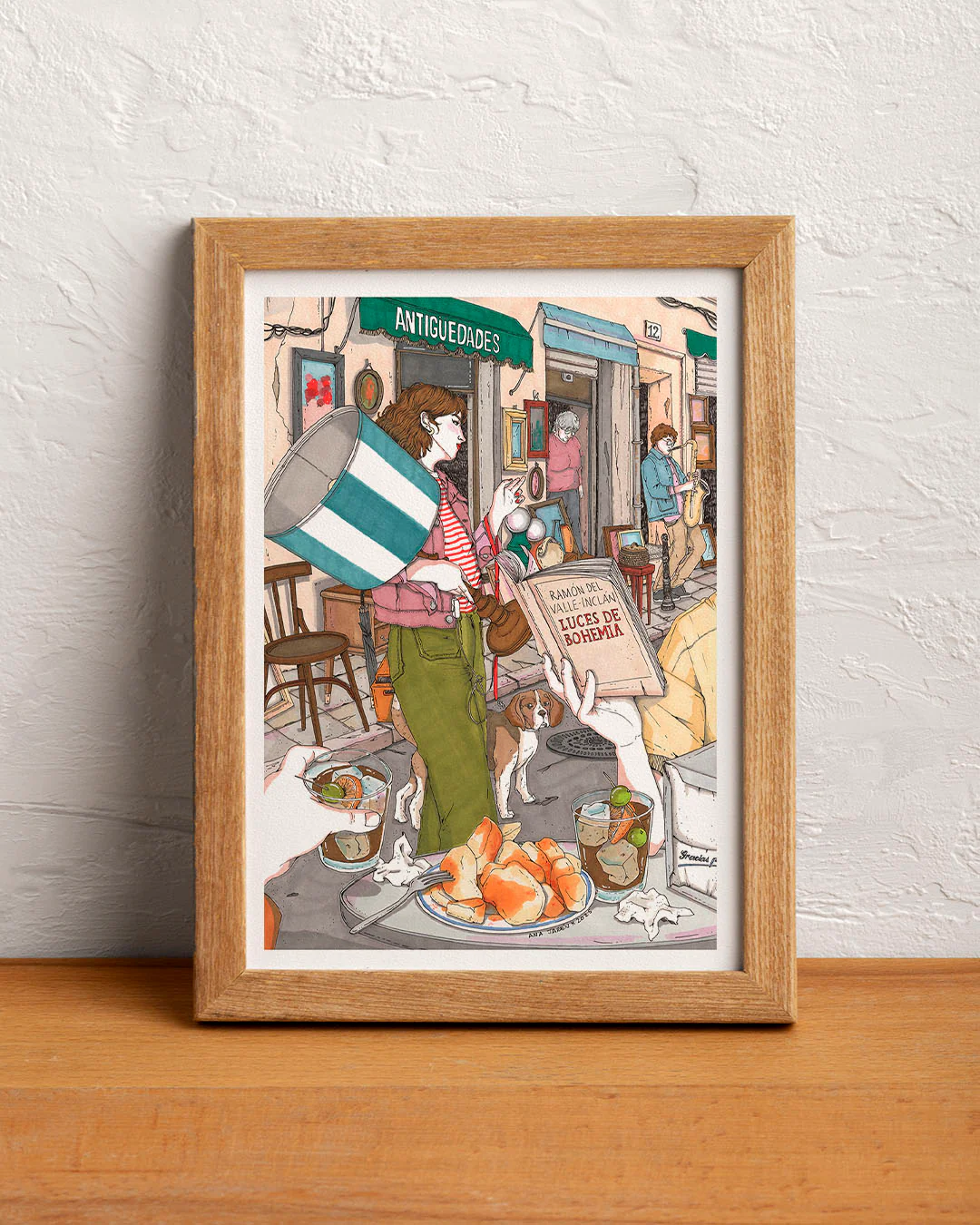 Esta vibrante ilustración de la artista española Ana Jarén captura la energía bulliciosa del famoso mercadillo madrileño, El Rastro. La obra presenta puestos animados, patrones, elementos arquitectónicos y figuras que se mueven entre coloridas exhibiciones, lo que la convierte en una impresión lúdica pero rica en detalles, perfecta para decorar hogares u oficinas.