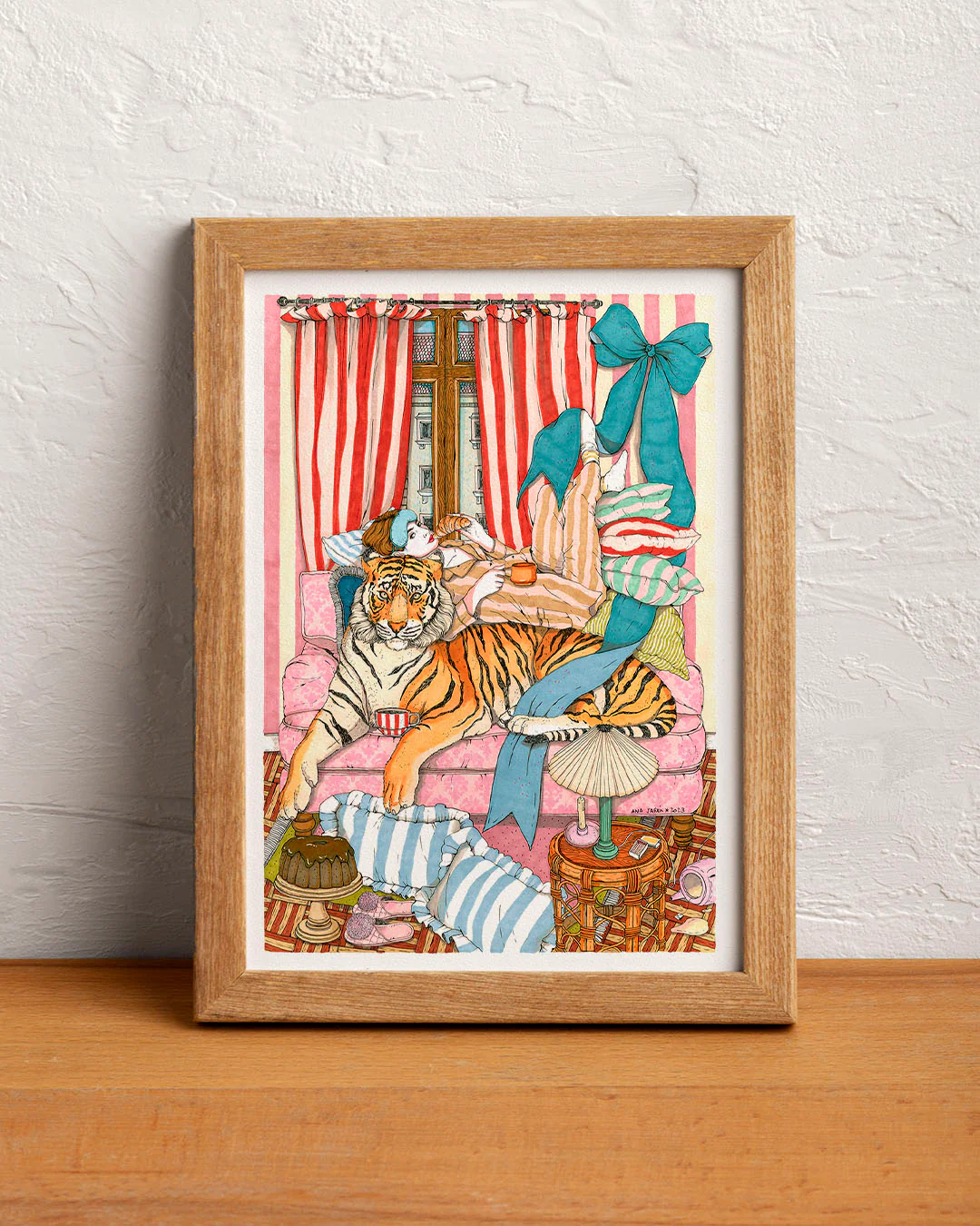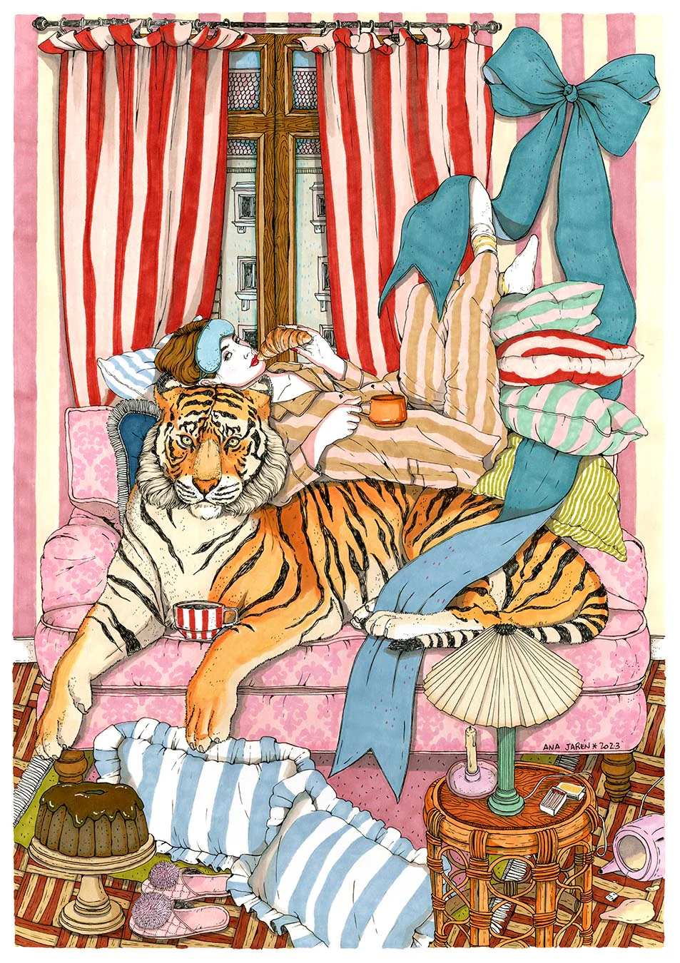 Tigre es una cautivadora ilustración de la artista Ana Jarén, que muestra a una mujer elegante descansando junto a un majestuoso tigre, entre libros y un sofá acogedor, todo representado con su característico estilo vibrante y lleno de texturas. Esta obra combina la tranquilidad doméstica con una inesperada compañía salvaje, aportando un toque único a la decoración interior.