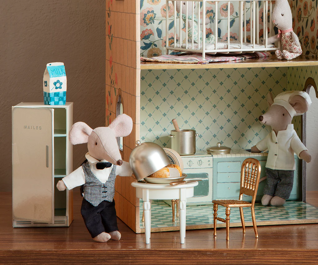 Esta encantadora quesera en miniatura con su pequeño trozo de queso es el complemento ideal para casas de muñecas, escenarios en miniatura o juegos de fantasía con ratones de Maileg.