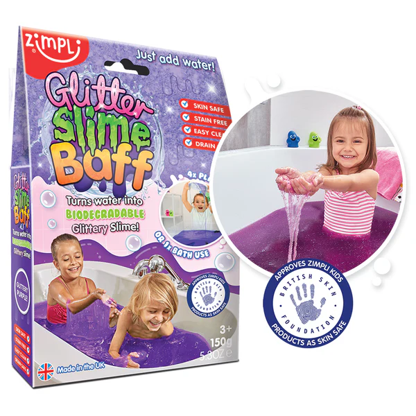 El Glitter Slime Baff púrpura transforma el agua en un slime fluido, pegajoso y con un espectacular efecto glitter morado. Es perfecto para preparar una bañera llena de textura brillante o para crear una bandeja de juego sensorial más espesa.