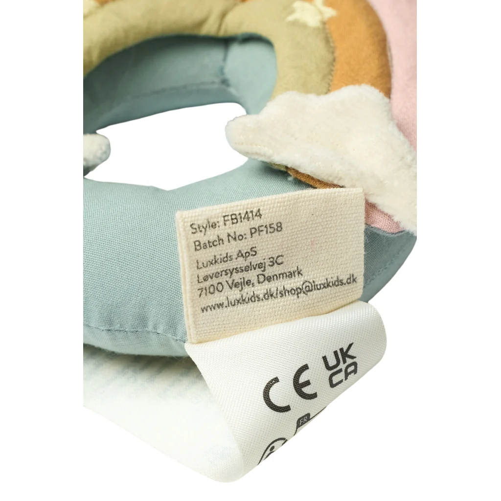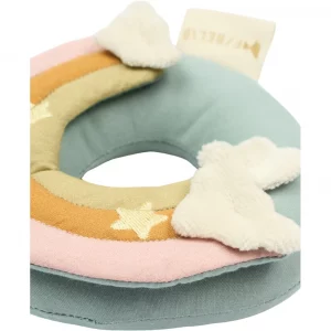 El sonajero Arcoíris es fácil de sostener y agarrar para las manitas de los más pequeños. Su tejido de algodón ofrece una superficie suave y táctil, animando a tu bebé a explorar diferentes sensaciones al agarrar y agitar el sonajero.