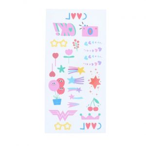 Este súper set incluye 2 hojas de 24 tatuajes temporales con una variedad de diseños divertidos y coloridos: corazones, globos, flores, estrellas y otros dibujos divertidos. Tu hijo puede elegir entre una multitud de diseños para crear su propio mundo mágico.