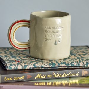 La taza Cloudy de Bloomingville es una taza elegante y encantadora con el texto «Eres mi arcoíris en un día lluvioso» y un arcoíris como asa.