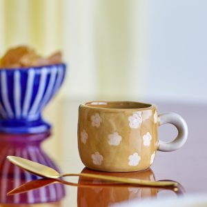 La taza Nini de Bloomingville es una taza suave y redondeada con un asa divertida. Está pintada a mano y decorada con delicados motivos florales, con un sutil efecto de relieve que añade una textura delicada a su tono cálido.