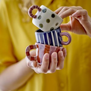 Su asa está decorada con rayas en tonos rojos y rosas, mientras que la taza está adornada con lunares verdes.
