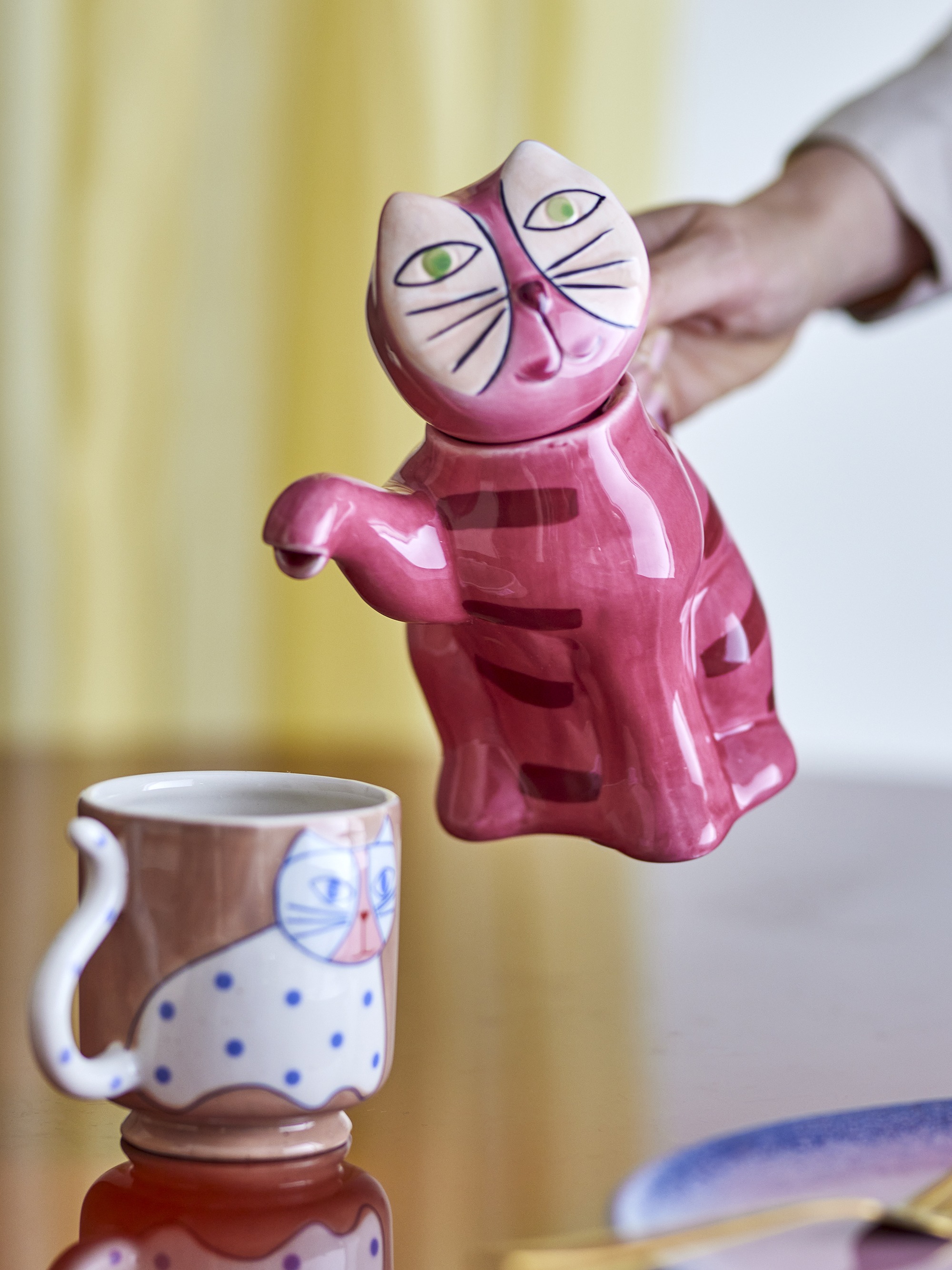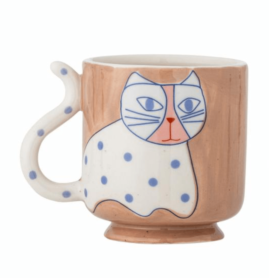 Cada taza hecha de cerámica presenta un original diseño de gato con lunares azules y presenta variaciones únicas de color y superficie.