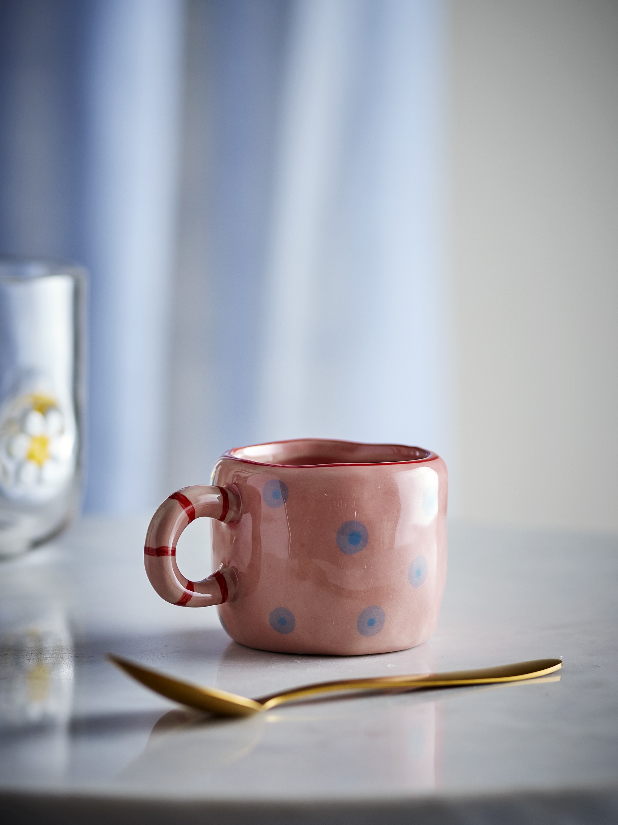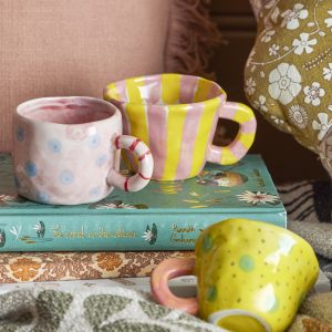 La taza Nini de Bloomingville está hecha de gres y esmaltada en tonos rosa, azul y rojo, creando un diseño original y divertido.
