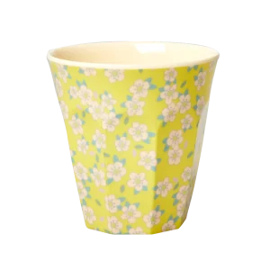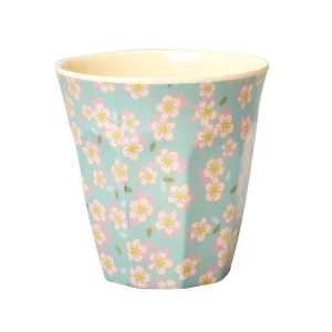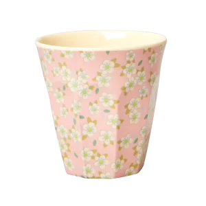 Vasos de melamina con el estampado floral blanco más dulce sobre fondos en diferentes colores delicados.